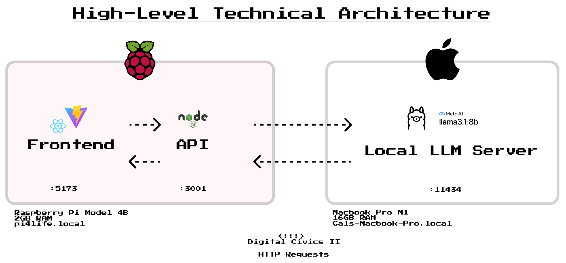 Running the LLM on the Raspberry Pi itself was quickly ruled out — the 2GB RAM severely limited options to poorly performing models. Instead, I proposed a hybrid-local architecture: the Pi hosts the web application and API, while Llama 3.1 8B runs on my MacBook Pro M1 (16GB RAM) via Ollama on the same local Wi-Fi network.